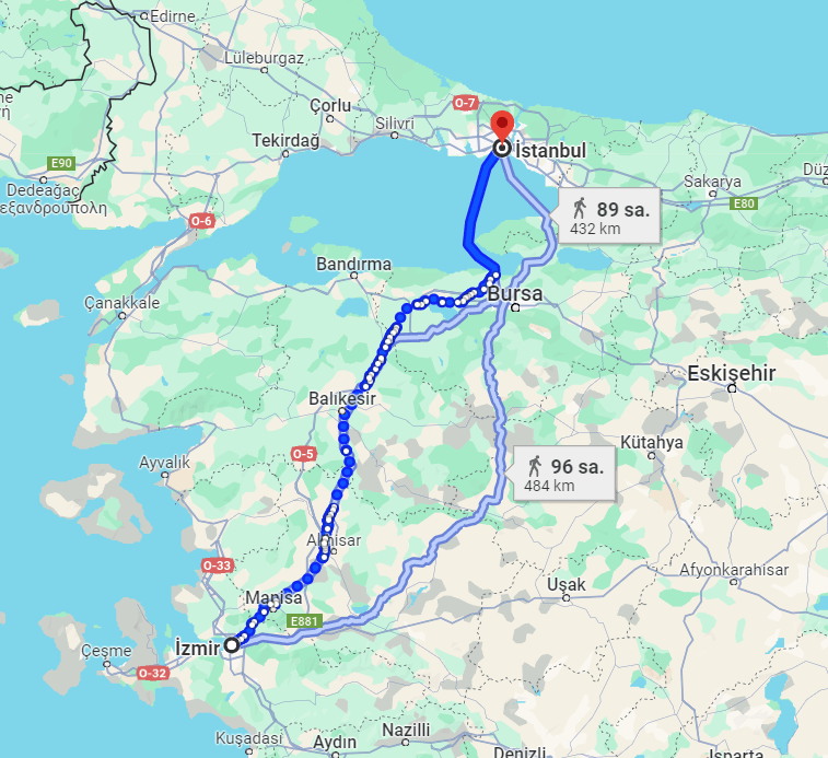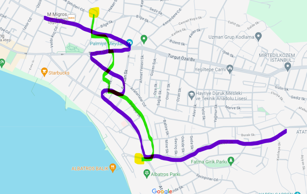 Sarı çizgi: Harekete başlama ve bitirme noktalarım
